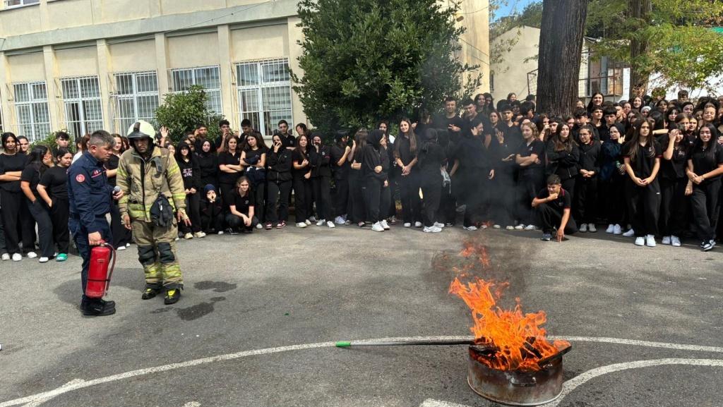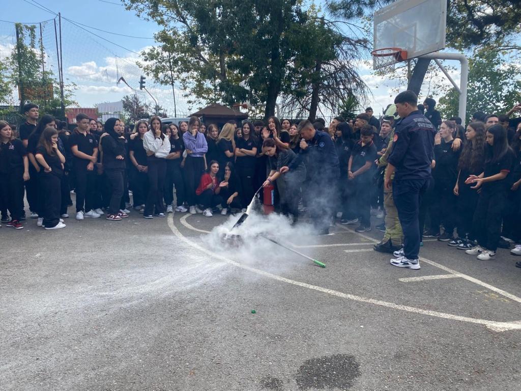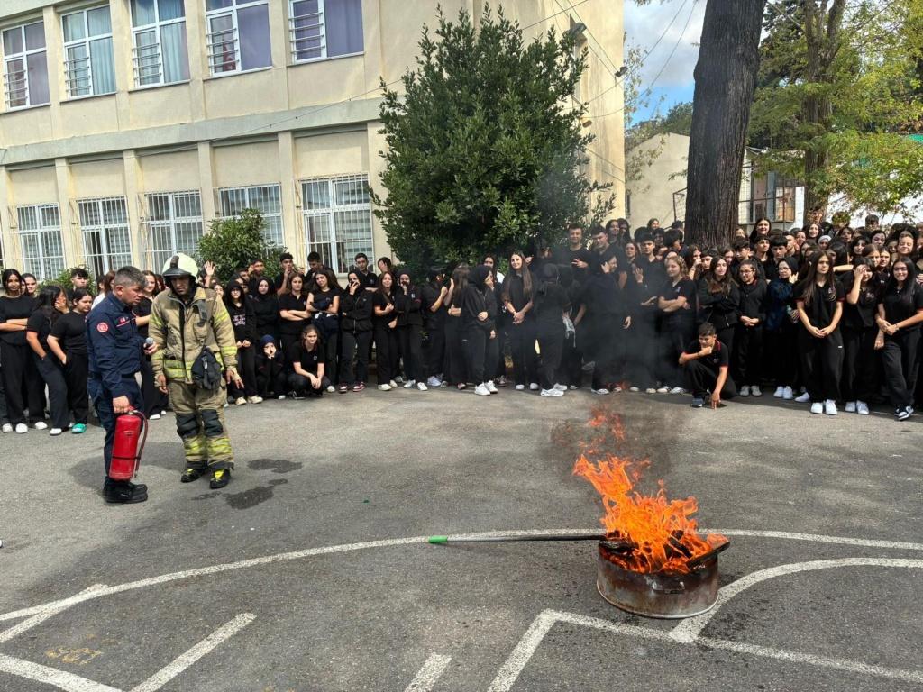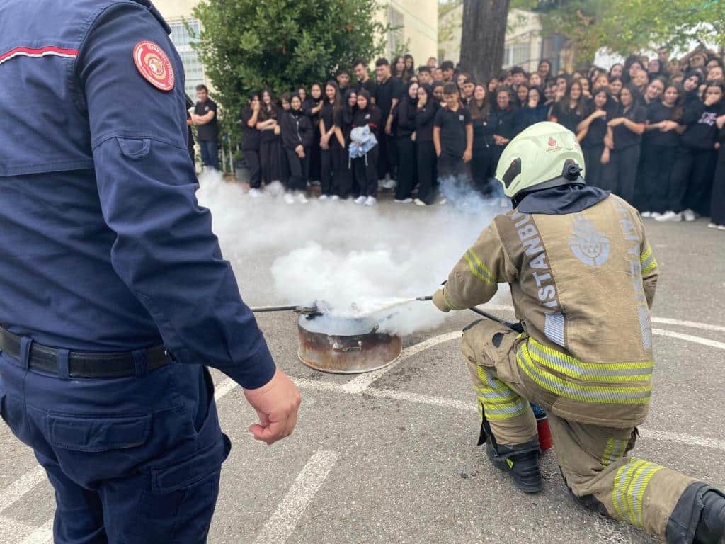 İtfaiye ekiplerince gerçekleştirilen bilgilendirme ve uygulamalı eğitim: genel yangın türlerinin tanıtılması, yangına doğru şekilde müdahale yöntemlerinin anlatılması ve yangın söndürme tüpü kullanımının uygulamalı olarak gösterilmesi.